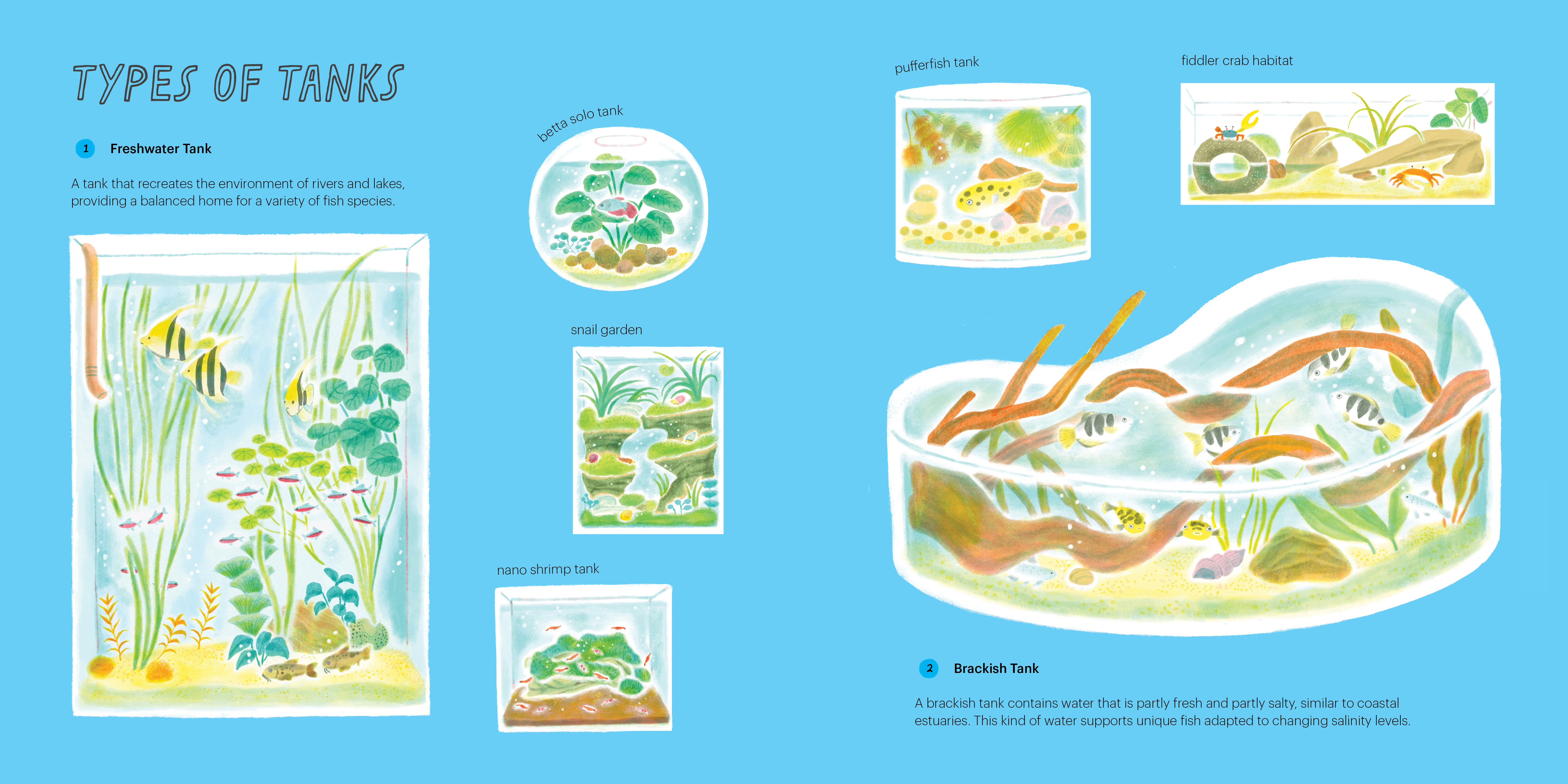 , a non-fiction book pitch project on information around home aquariums including aquarium types, common fish, tools, steps to build, and other fun facts.