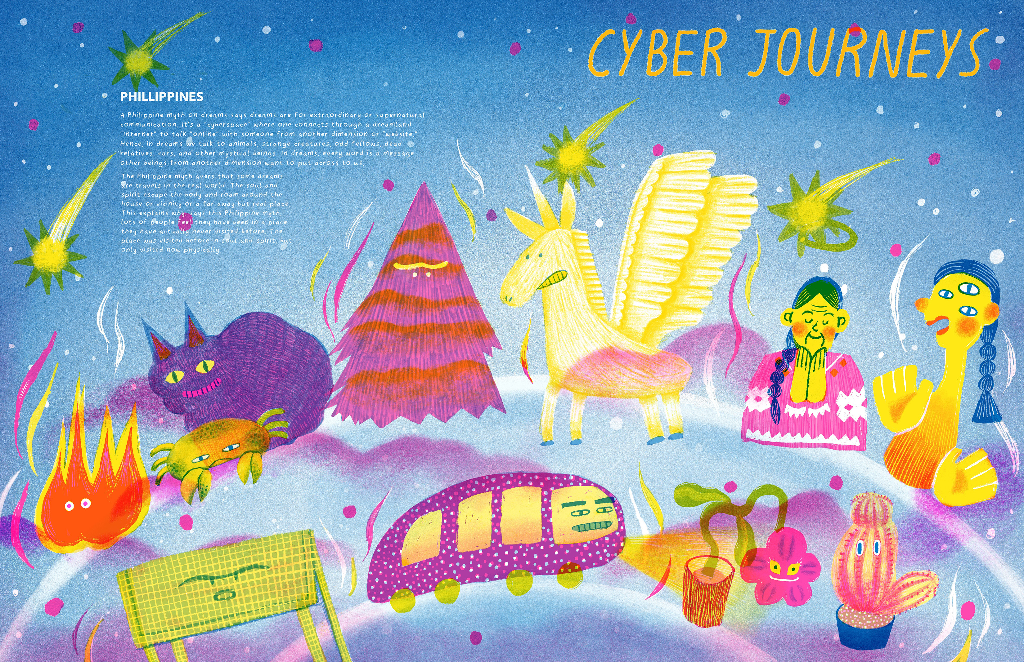 this project is an illustrated book pitch on cultural beliefs about dreams in certain regions around the globe. Inspired by some interestingly odd dreams of mine, the book is both written and illustrated by me as a form of exploration into the fascinating experiences we encounter when unconscious. The content is largely fact-based, aiming on audiences interested in anthropology and cultures.