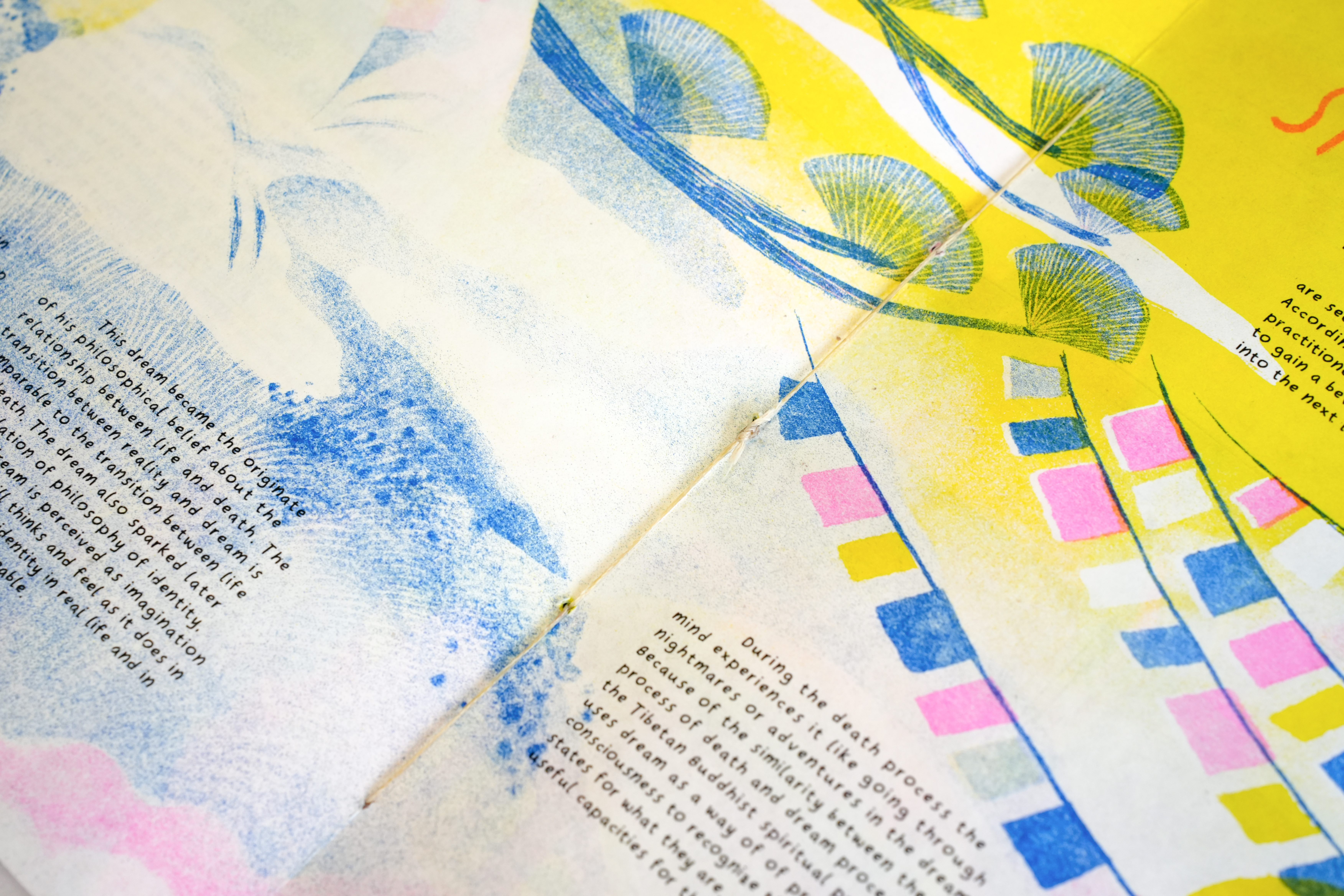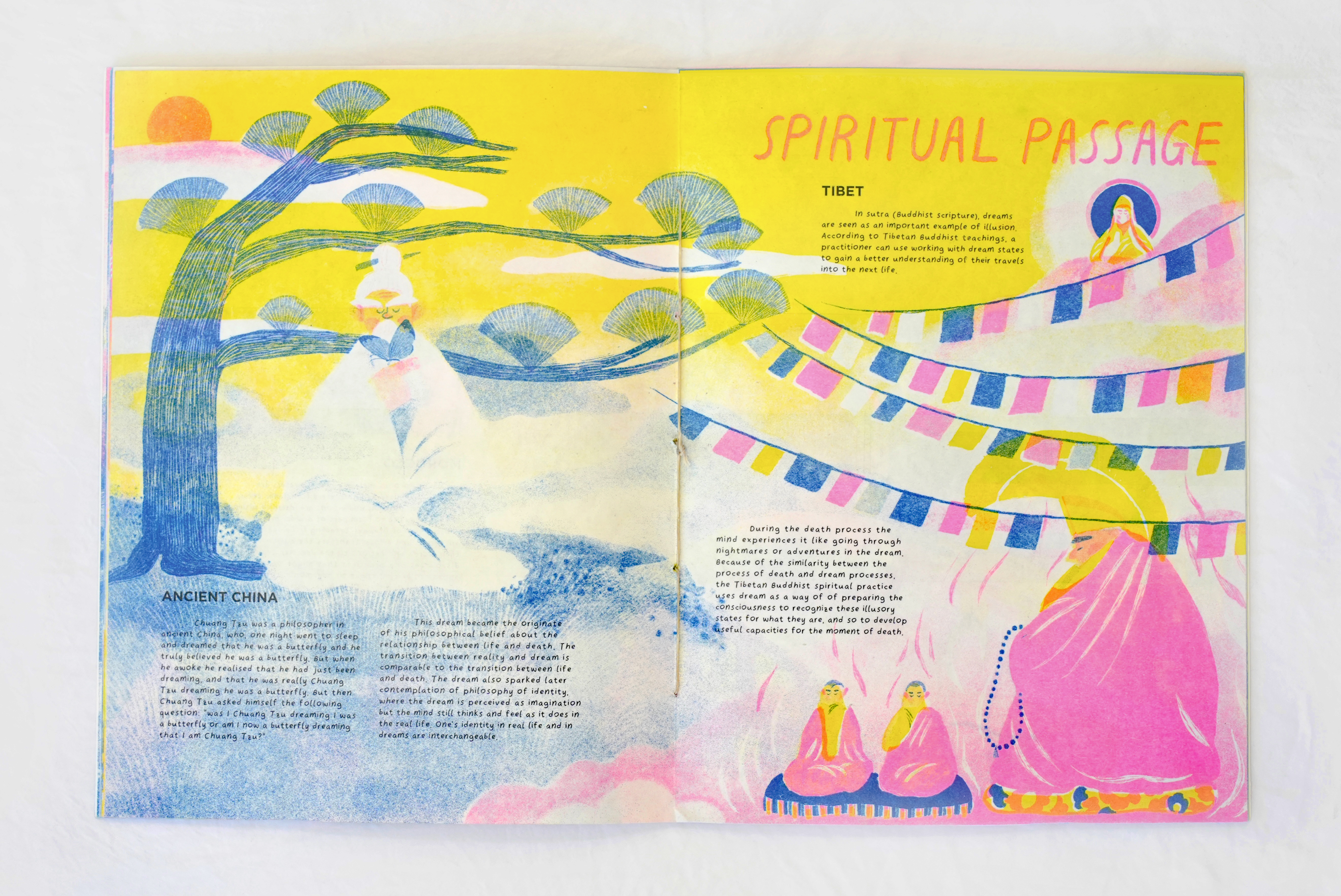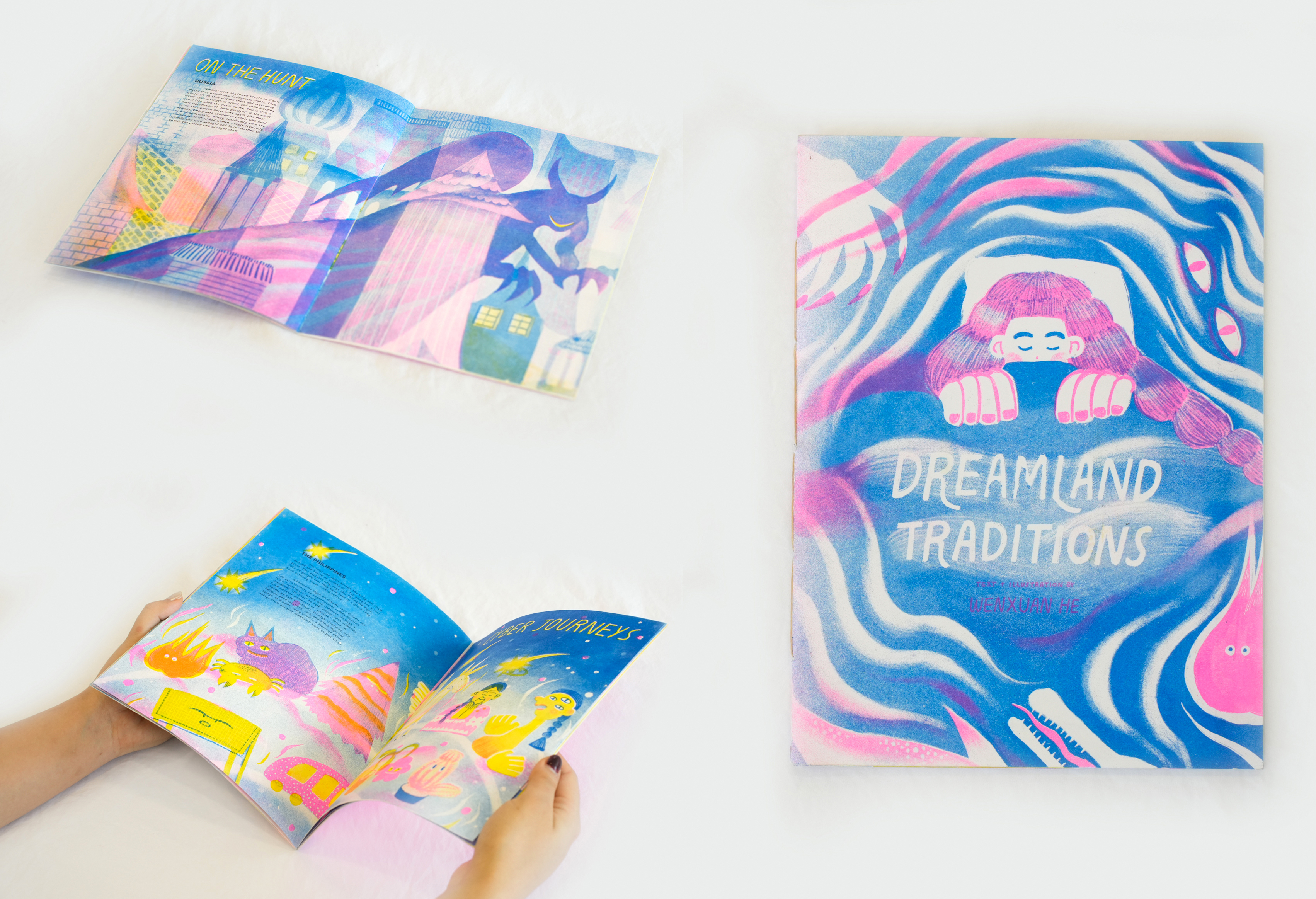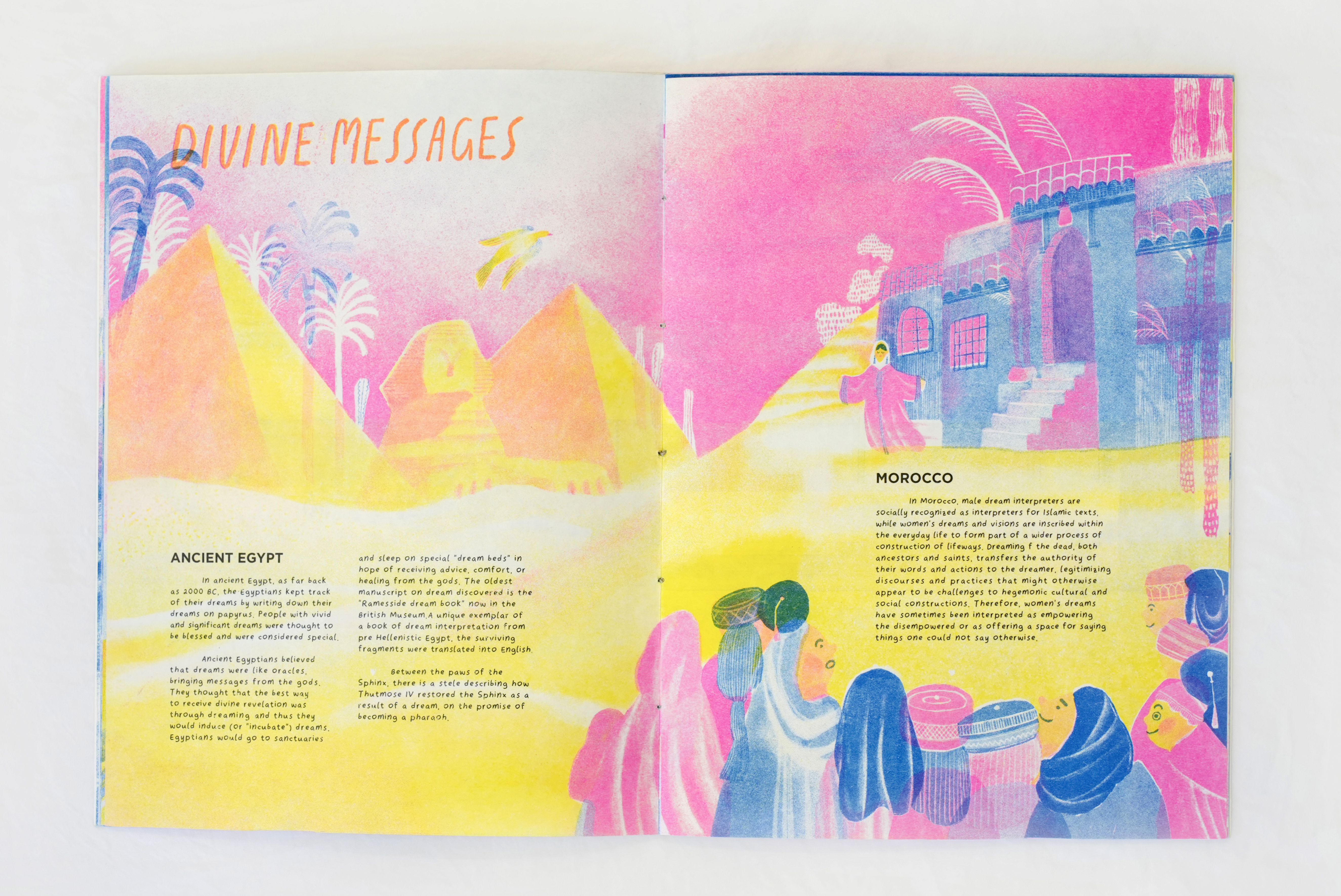 The book is risograph printed and bound by myself, in four inks (florescent pink, yellow, blue, black).