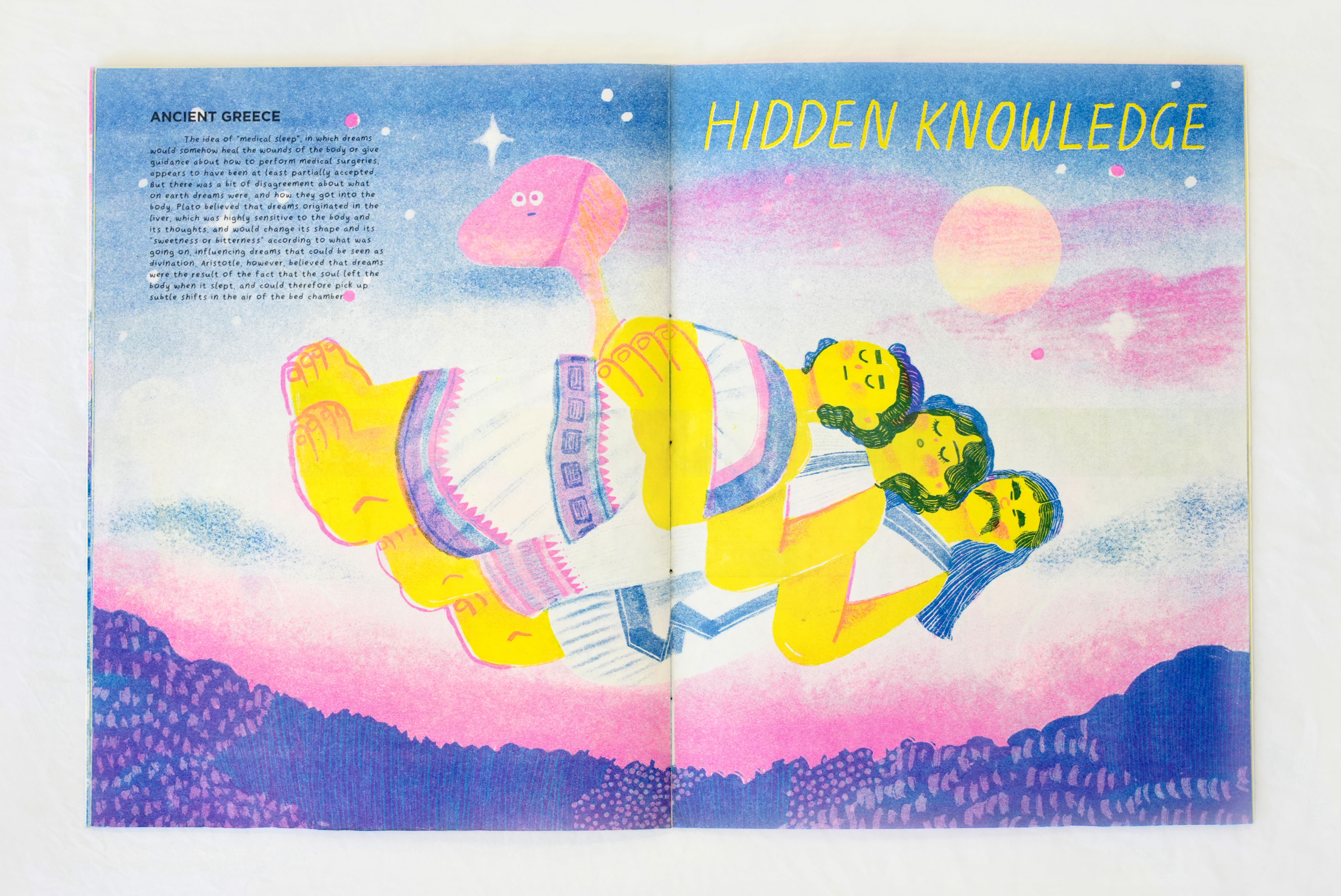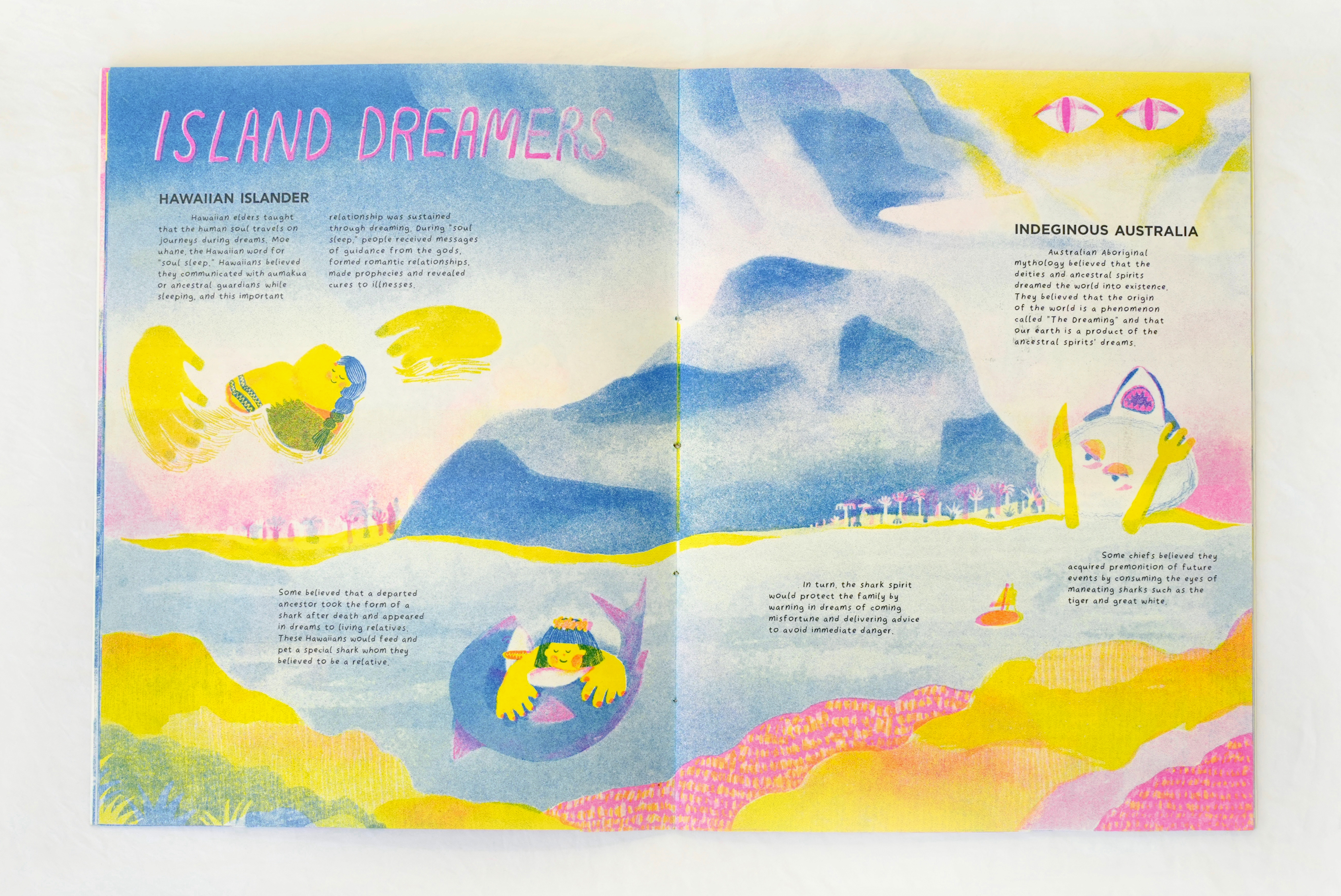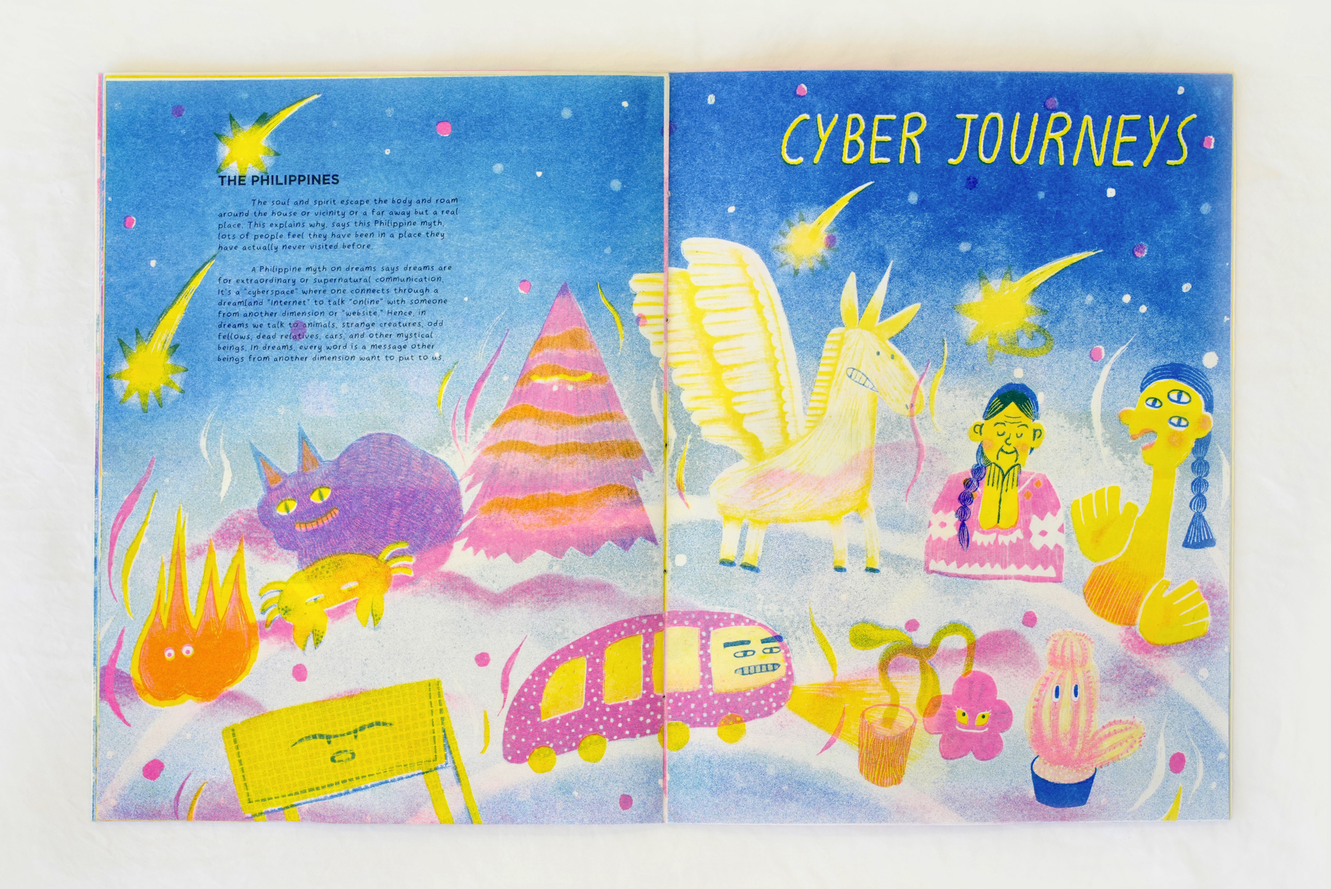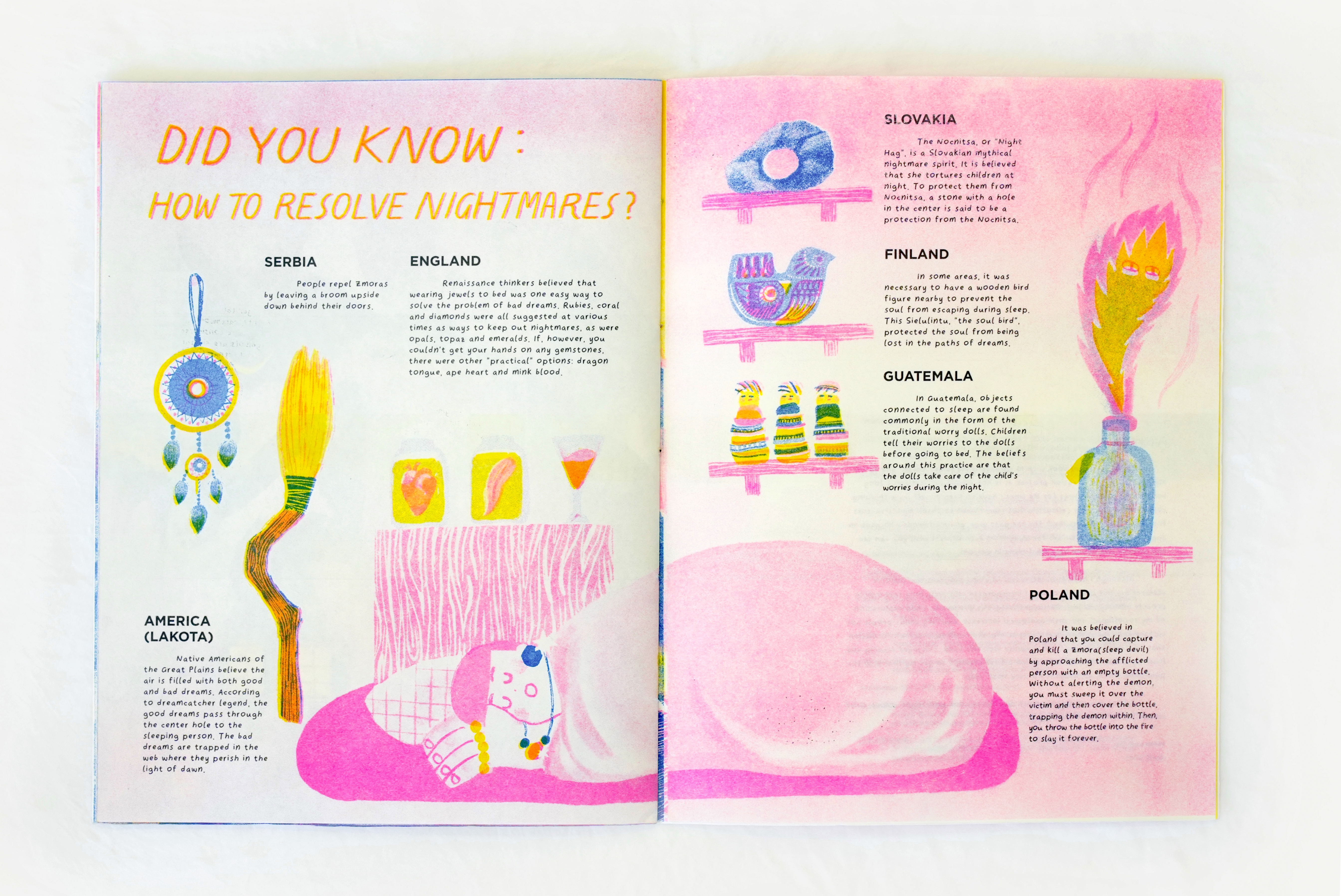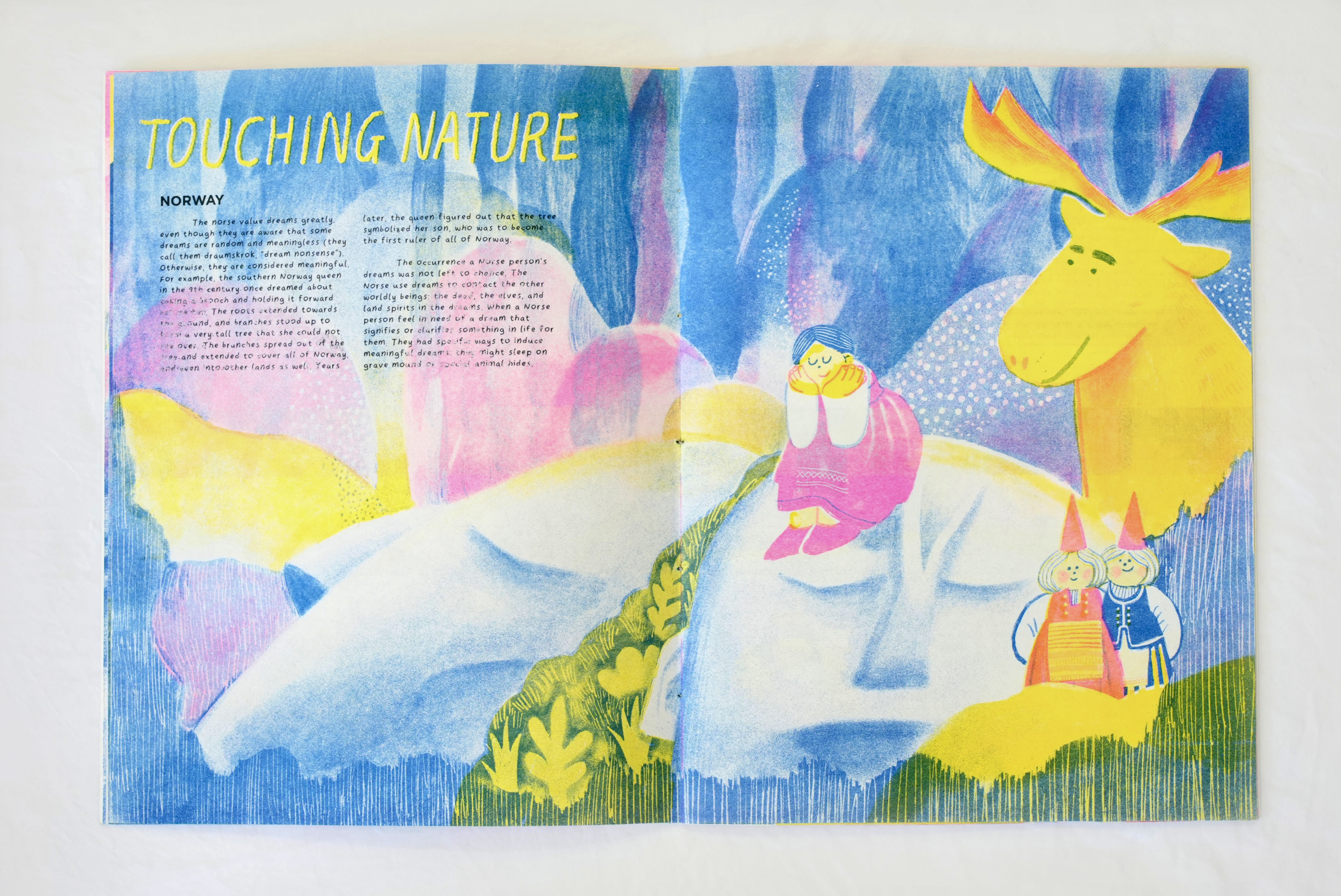 The book is risograph printed and bound by myself, in four inks (florescent pink, yellow, blue, black).