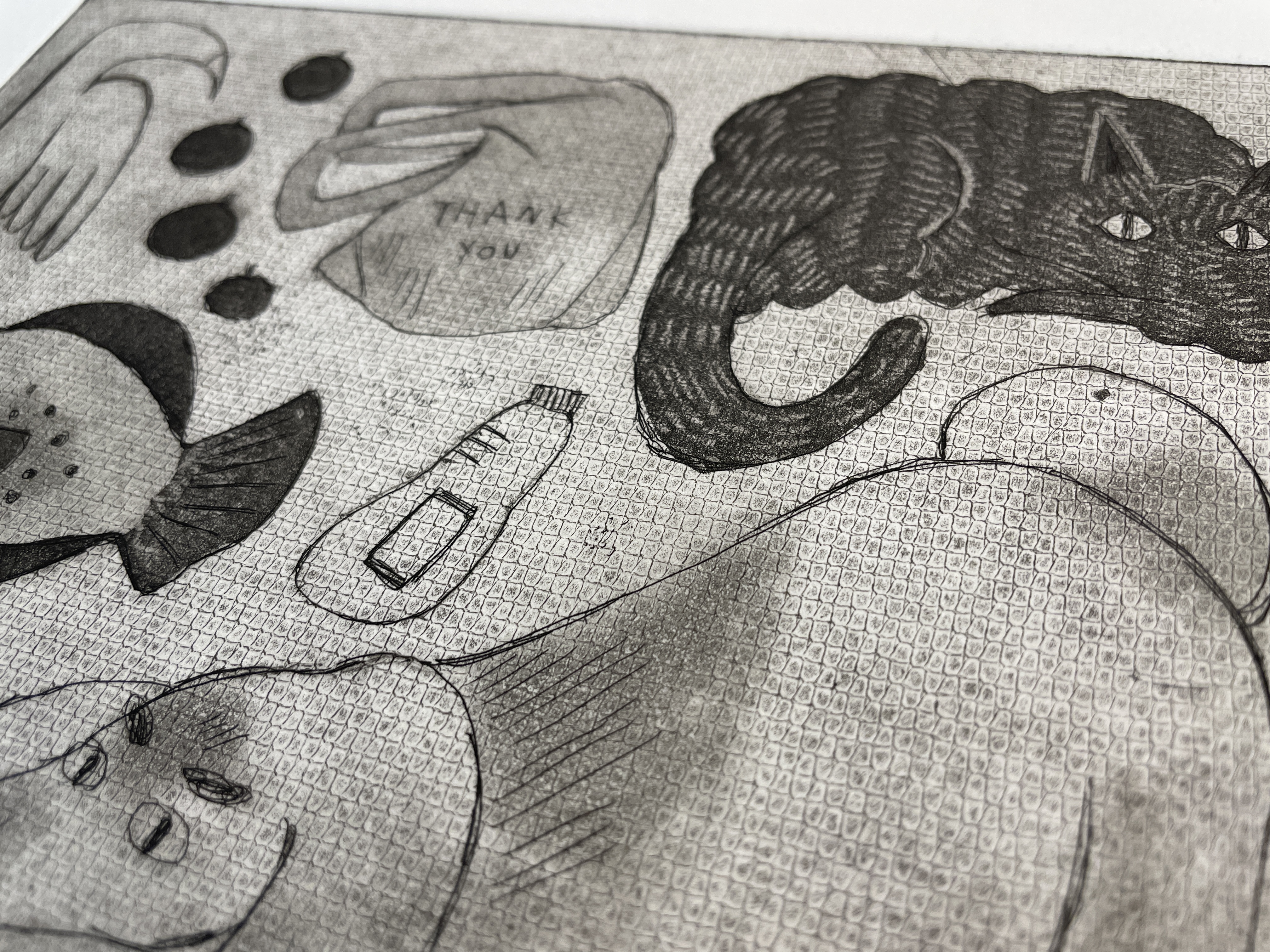 Copperplate intaglio print. Techniques include hard ground etching, soft ground etching, dry point, rosin/spray aquatint, and spit bite.